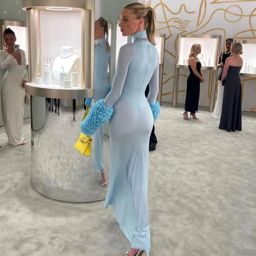 qgtao Autumn Turtleneck Maxi Dress Women Elegant Long Sleeve Slim Evening Party Dresses Winter Sexy See Through Night Club Outfit 2024