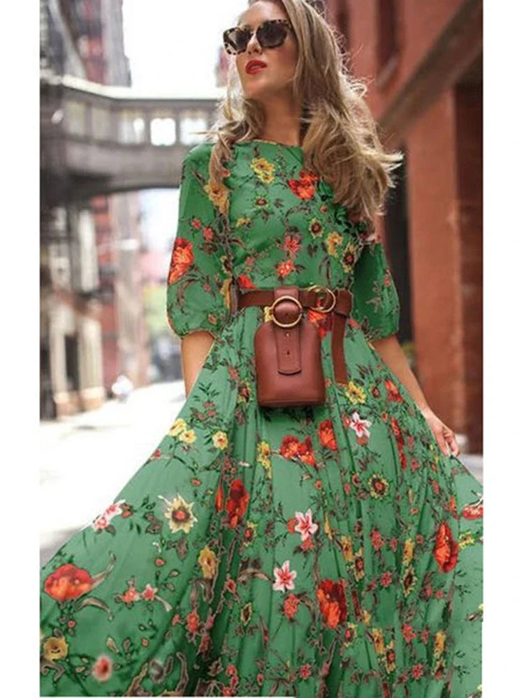 qgtao Spring Summer Vintage Flower Floral Print Maxi Dress Office Lady Fashion Elegant Long Sleeve O-neck Dresses For Women 2024