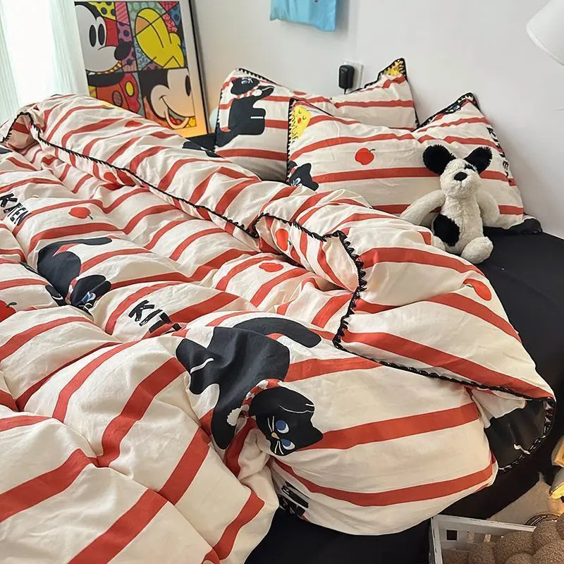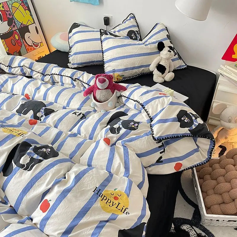 Yeknu Bedding Set Double Layered Yarn INS Girls Mushroom Soft Washed Cotton Bed Sheet Queen King Size Duvet Set Pillowcase Bed Sheet