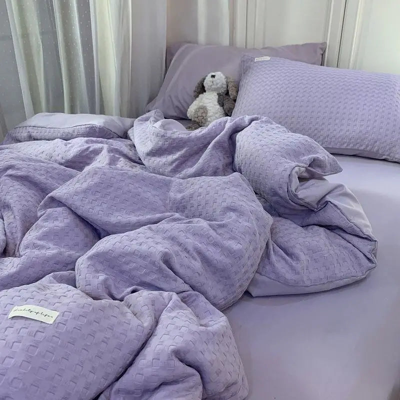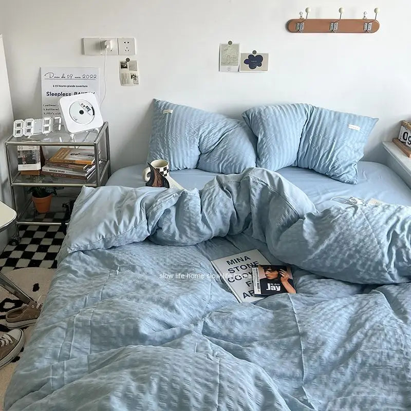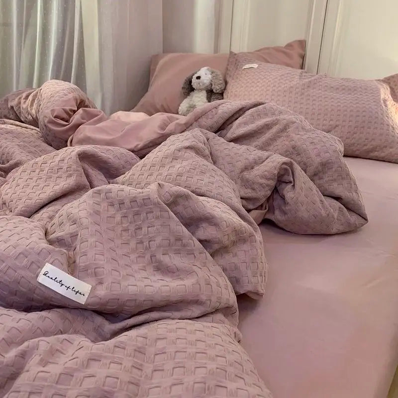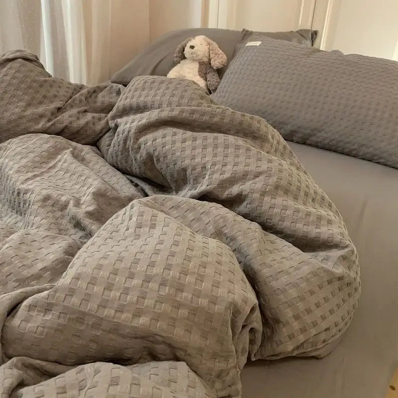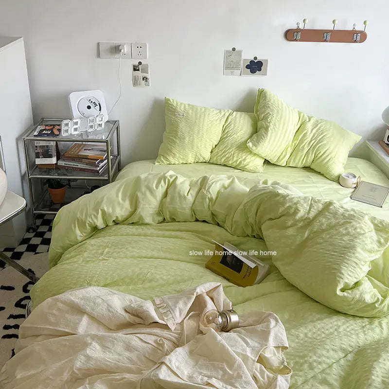 Yeknu Bedding Set Luxury High Grade Light Washable Cotton Waffle Four Piece Olive Green Quilt Cover Bed Sheet Dormitory Three Piece