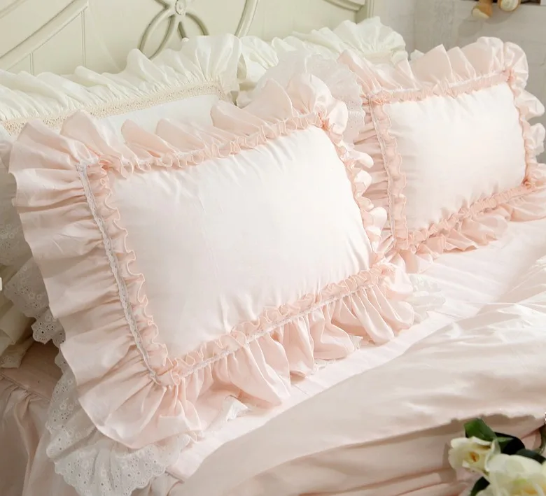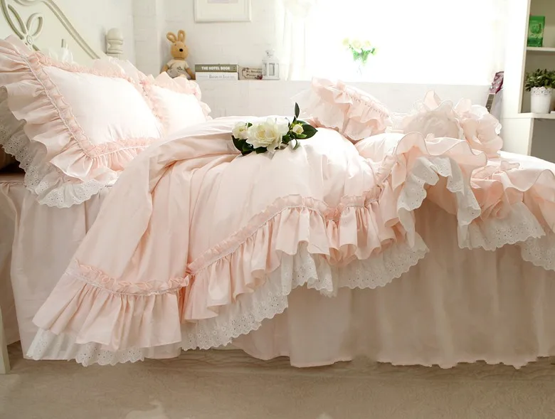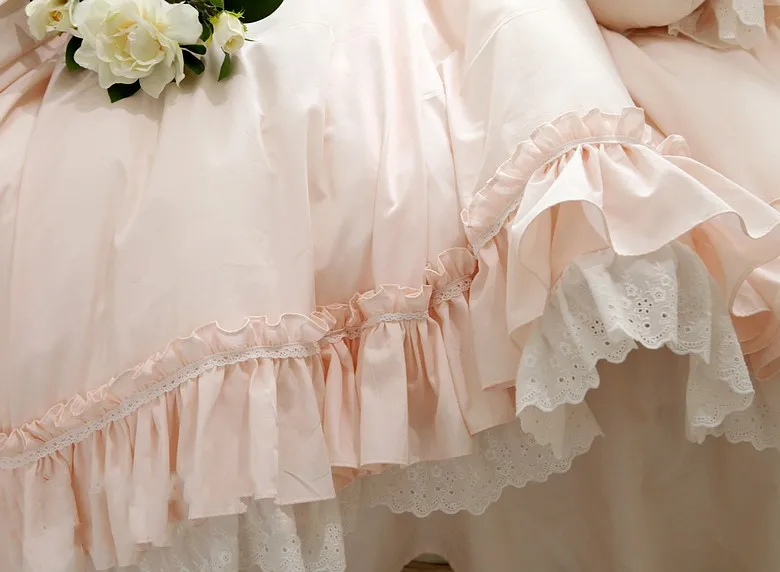 Yeknu Super Sweet Solid Color Bedding Sets Luxury Princess Wedding Pink Lace Ruffle Cotton Duvet Cover Bedspread Bed Skirt Pillowcases