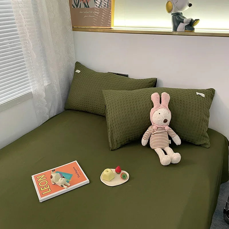 Yeknu Waffle Four Piece Set Simple Washed Cotton Solid Color Bed Sheet Duvet Cover Pillowcase No Duvet and Pillow Core Bedding Set